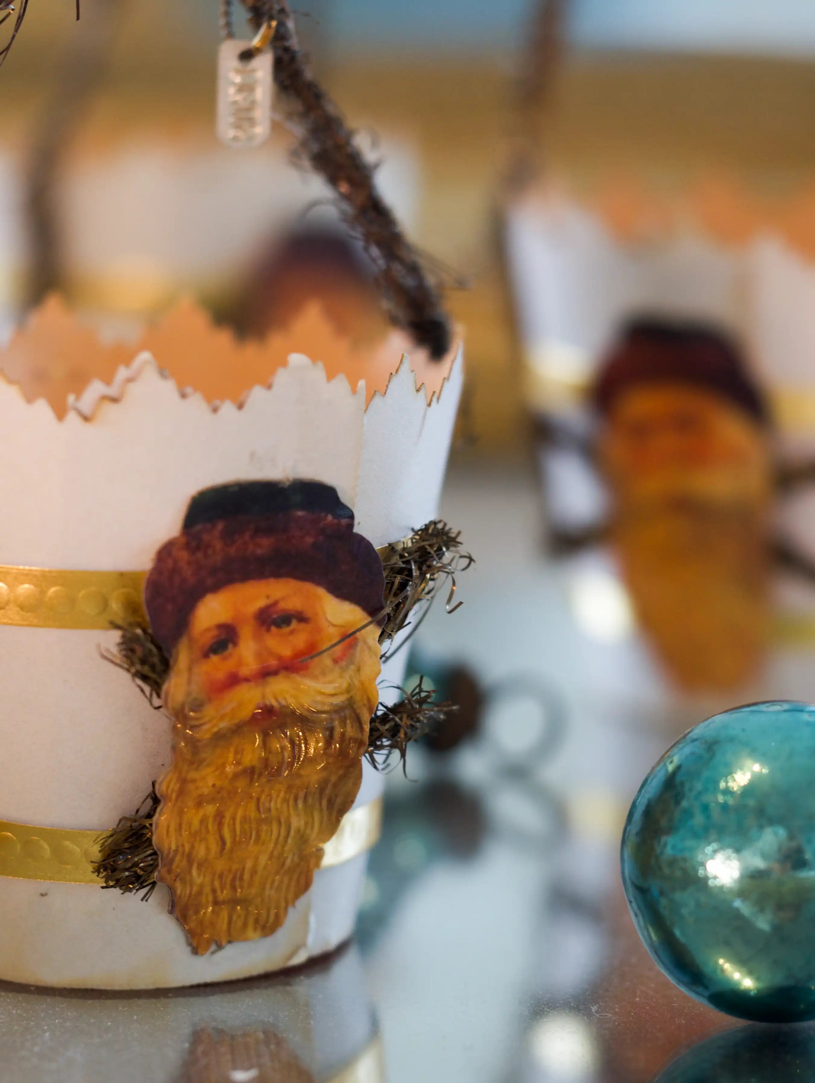 Inspired by an actual 1900s candy container, this charming ornament is a nostalgic tribute to vintage Christmas traditions. The paper has been meticulously hand-dyed to match the exact pale blue hue of the original antique, giving it an authentic, timeworn feel. At the center of the piece is a glossy, vintage-style image of Santa Claus, his warm expression reminiscent of early 20th-century holiday illustrations.