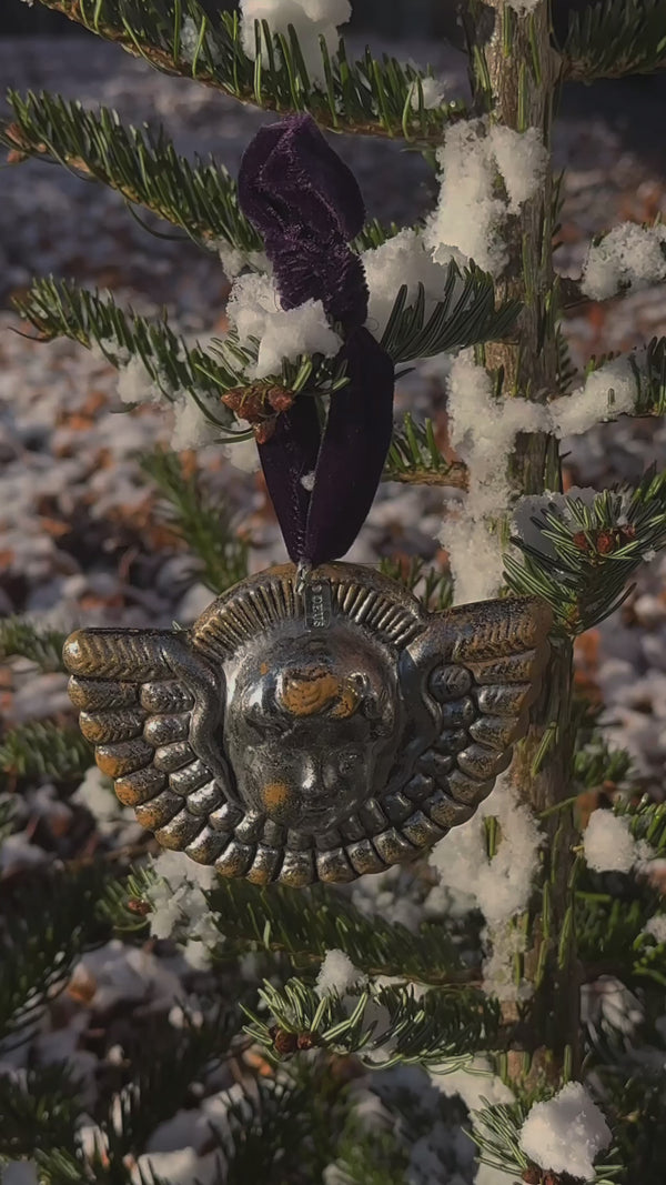 Silver-colored angels head and wings, inspired by 1910 Dresden, Germany ornament. The ornament of a framed cherub appears to be both audience and actor. Hand-made in metal. Crafted with meticulous attention to detail, our angel ornament draws inspiration from authentic antique designs, reviving the classic beauty and sophisticated craftsmanship of historical Christmas adornments.
