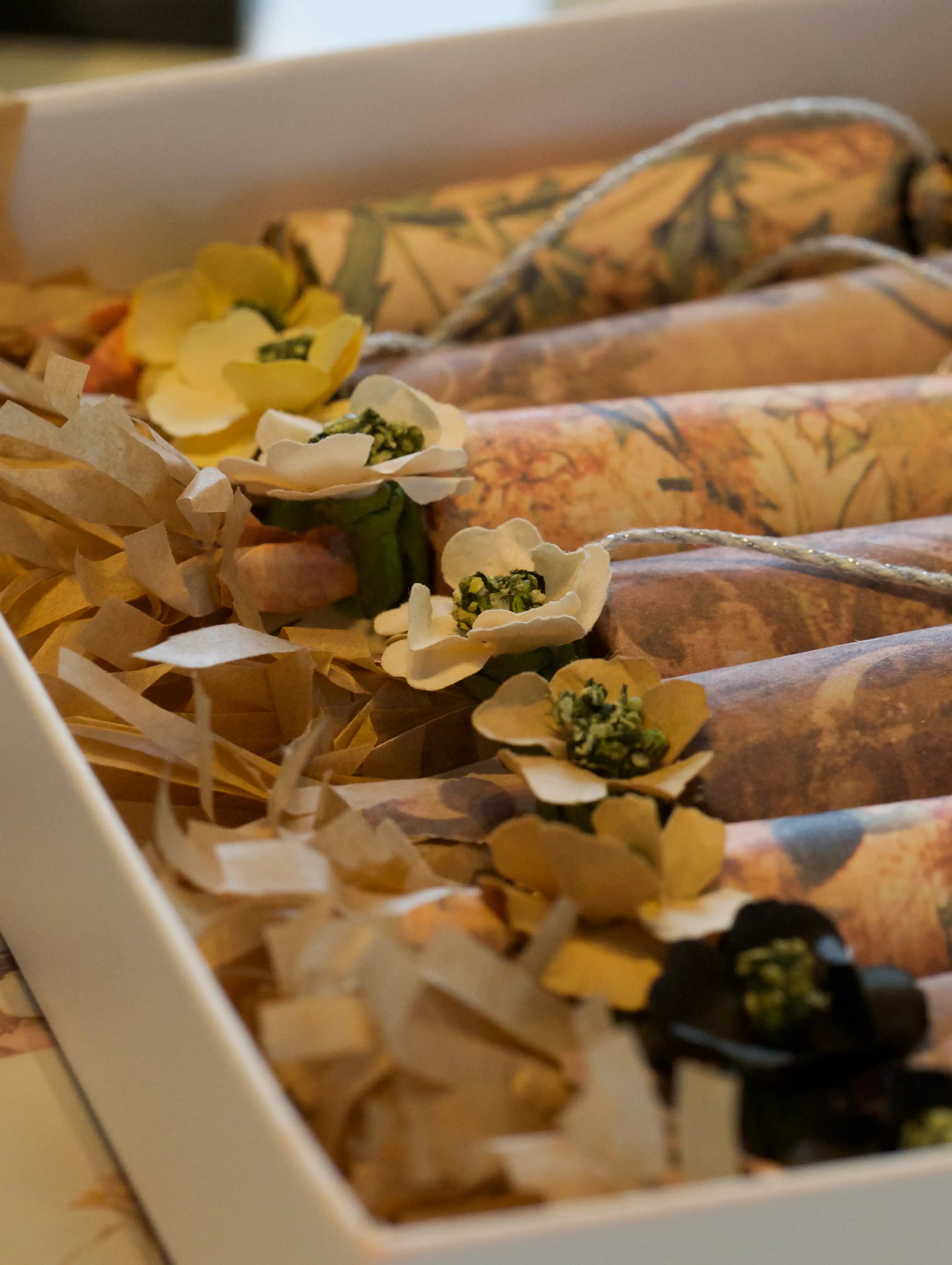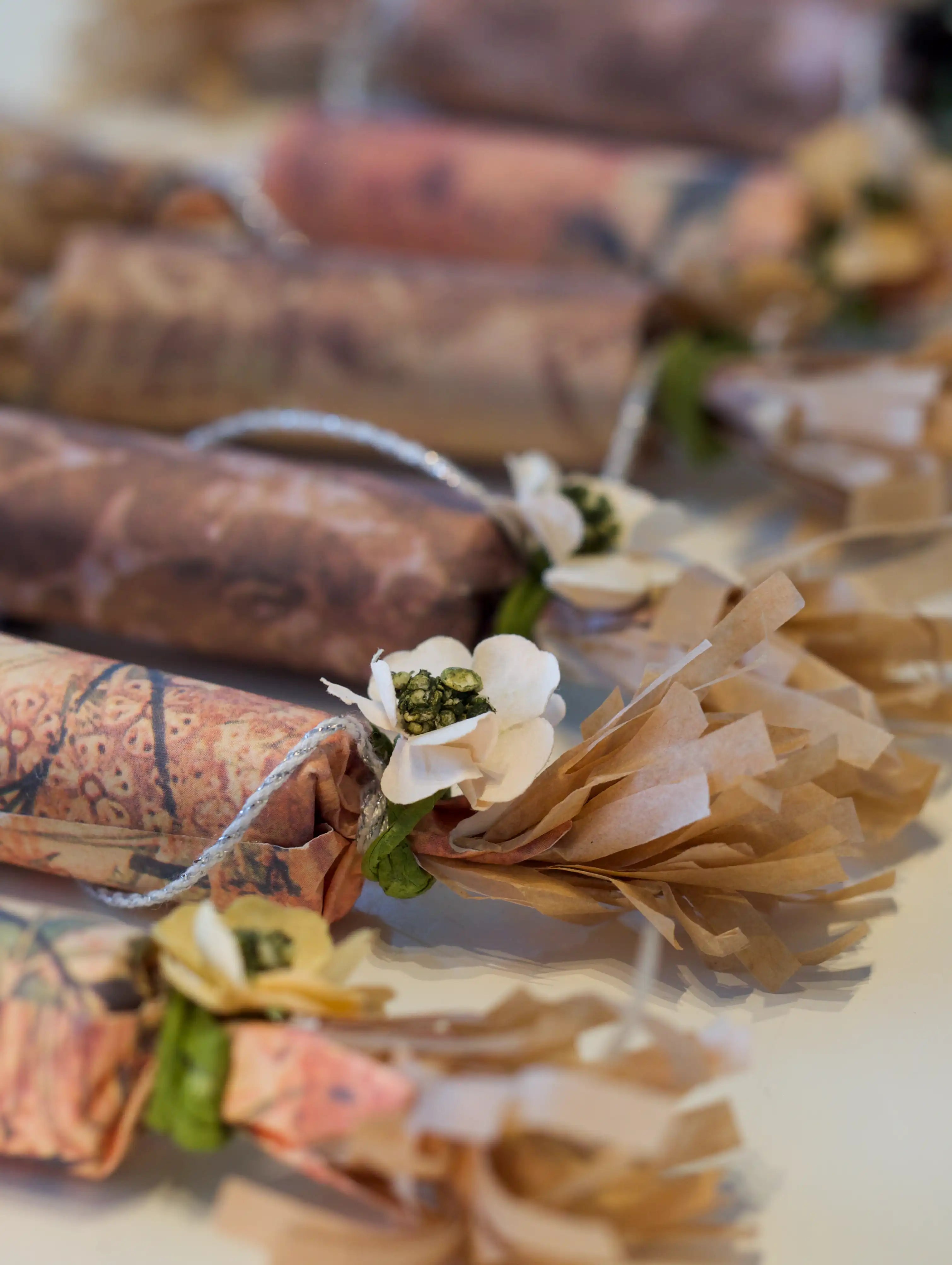 Each cracker in this set is meticulously hand-made, resulting in subtle individual variations that make every piece unique—much like the artisanal creations of the Victorian period. Crafted from high-quality, vintage-style patterned papers in warm earth tones featuring delicate floral motifs, they evoke the natural, understated palettes of antique decorations. The ends are finished with fringed tissue paper for a textured, whimsical fringe effect, and each one is adorned with a small, carefully attached artificial flower, adding a touch of blooming elegance reminiscent of traditional European holiday garlands.